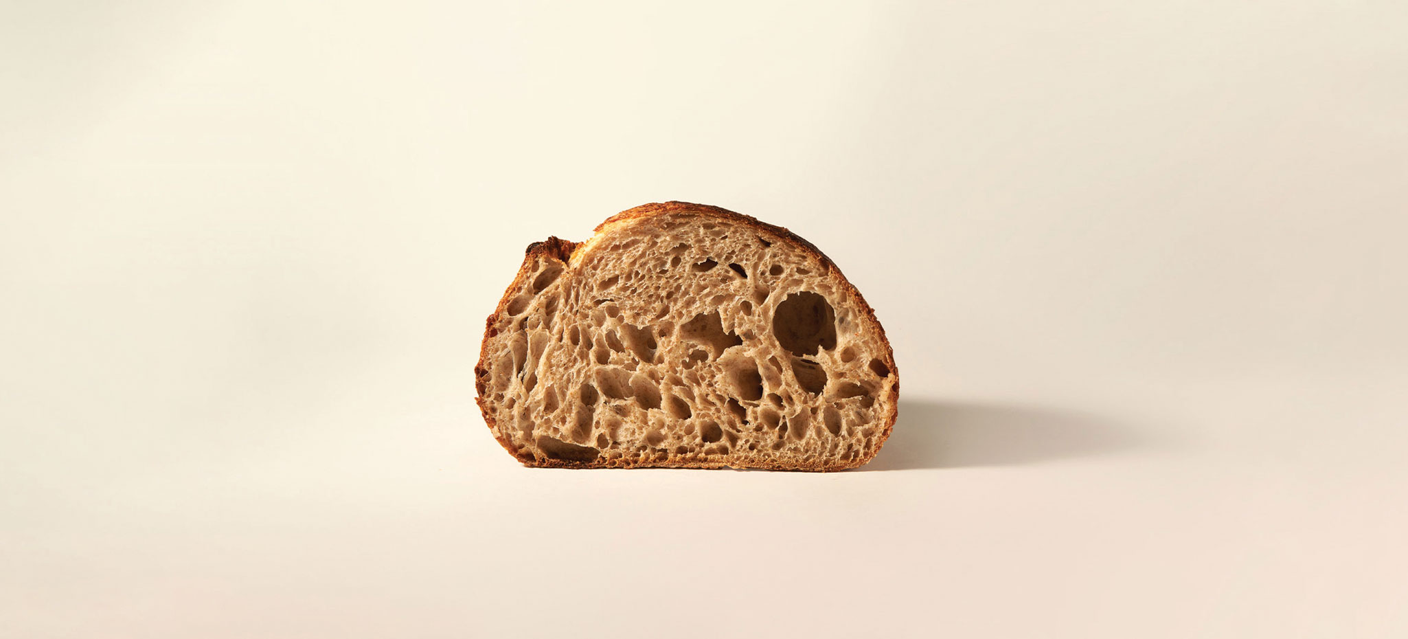 цельнозерновой серый хлеб из трёх видов муки с ярко выраженной кислинкой благодаря долгой ферментации (двое суток) и закваске, с пористым мякишем и в меру грубой хрустящей корочкой
